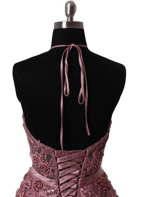 Halter Dusty Red See Through A line Lace Long Custom Evening Prom Dresses, 17408